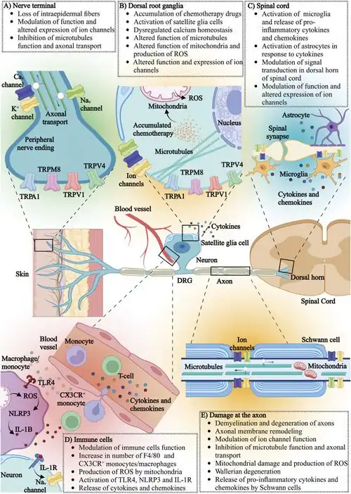 - ↑ 4.00 4.01 4.02 4.03 4.04 4.05 4.06 4.07 4.08 4.09 4.10 4.11 4.12 4.13 4.14 4.15 4.16 4.17 Zajączkowska R, Kocot-Kępska M, Leppert W, Wrzosek A, Mika J, Wordliczek J (March 2019). "Mechanisms of Chemotherapy-Induced Peripheral Neuropathy". International Journal of Molecular Sciences. 20 (6): 1451. doi:10.3390/ijms20061451. PMC 6471666. PMID 30909387.