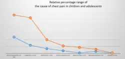 Chest pain in children is usually evaluated in the emergency departments. It can be distressing for parents and children. Pediatric chest pain differs from chest pain in adults because it is most often unrelated to the heart.[2] The causes of pediatric chest pain vary according to the organ or tissue in the child. that generates the pain. Generally, muscular skeletal pain, which includes costochondritis, is the reason for the emergency department visit. Pain that is felt in the chest but is due to muscular skeletal inflammation or an unknown cause and accounts for 7% and 69% visits. Muscular skeletal pain is described and defined differently as a diagnosis of exclusion or is documented as being associated with idiopathic causes. Asthma and other respiratory symptoms are the second most common presentation. Respiratory associated causes compose 13% to 24% of pediatric chest pain symptoms. Gastrointestinal and psychogenic symptoms reported by parents and patients occur less than 10% of the time. Cardiac causes of pediatric chest pain are found infrequently and are not identified more than 5% of the time. Unknown causes, were estimated to account for 20% to 61% of the final diagnosis given. Patients who receive a diagnosis of cardiac disease are more apt to have acute pain. This pain often awakes them from sleep or presents with fever or abnormal observations found during the physical examination. Trauma can also be a cause for chest pain and has been found to be associated with the pain in 5% of the patients.[1]