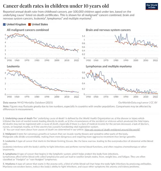 - ↑ Barrington-Trimis JL, Cockburn M, Metayer C, Gauderman WJ, Wiemels J, McKean-Cowdin R (March 2017). "Trends in childhood leukemia incidence over two decades from 1992 to 2013". International Journal of Cancer. 140 (5): 1000–1008. doi:10.1002/ijc.30487. PMC 5550103. PMID 27778348.