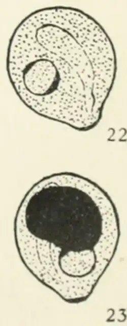 | Cysts of Chilomastix mesnili Fig. 22: The cytostome and nucleus clearly visible. Size 8.5 μm × 7.5 μm Fig. 23: The cytostome and nucleus partially obscured by large deeply staining mass of glycogen. Size 8.5 μm×7.5 μm | |