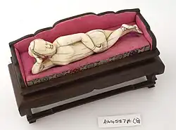 The dolls depicted a nude woman, lying either on her side or back, positioned in such a way that a user would be able to point to every part of the body.[5] They are typically made of ivory or jade and are uncolored, often with an accompanying pedestal shaped like a couch or bed made of ivory[5] or wood.[2] It is not uncommon, especially on older figures, for the woman to be depicted with small pointed feet, representative of the practice of foot binding which was common in China until the 20th century.[5][6] The figures typically measure anywhere from 75 to 150 mm (3.0 to 5.9 in) in length.[5] In addition to the functional form, many of the dolls depict aesthetic additions including jewelry, fans, and shoes, and some feature colored hair, typically painted with lacquer.[2][6]