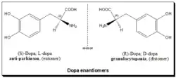 The initial use of racemic dopa for the treatment of Parkinson's disease resulted in a number of adverse effects viz. nausea, vomiting, anorexia, involuntary movements and granulocytopenia. The use of L-dopa [the (S)-enantiomer] resulted in reducing the required dose, and adverse effects. The granulocytopenia was not observed with the single enantiomer.[48][49][50]