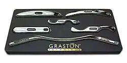 Graston Technique (GT) is a trademarked therapeutic method for diagnosing and treating disorders of the skeletal muscles and related connective tissue. The method was started by David Graston and employs a collection of six stainless steel instruments of particular shape and size, which are used by practitioners to rub [26] patients' muscles in order to detect and resolve adhesions in the muscles and tendons.[27] Practitioners must be licensed by the parent corporation (Graston Technique, LLC.) in order to use the Graston Technique trademark or the patented instruments.[28]
