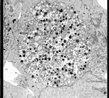 Chlamydia pneumoniae is a small gram-negative bacterium (0.2 to 1 μm) that undergoes several transformations during its life cycle. It exists as an elementary body (EB) between hosts. The EB is not biologically active, but is resistant to environmental stresses and can survive outside a host for a limited time. The EB travels from an infected person to the lungs of an uninfected person in small droplets and is responsible for infection. Once in the lungs, the EB is taken up by cells in a pouch called an endosome by a process called phagocytosis. However, the EB is not destroyed by fusion with lysosomes, as is typical for phagocytosed material. Instead, it transforms into a reticulate body (RB) and begins to replicate within the endosome. The reticulate bodies must use some of the host's cellular metabolism to complete its replication. The reticulate bodies then convert back to elementary bodies and are released back into the lung, often after causing the death of the host cell. The EBs are thereafter able to infect new cells, either in the same organism or in a new host. Thus, the lifecycle of C. pneumoniae is divided between the elementary body, which is able to infect new hosts but cannot replicate, and the reticulate body, which replicates but is not able to cause a new infection.[9]