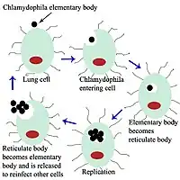 Chlamydia psittaci is a small bacterium (0.5μm) that undergoes several transformations during its lifecycle. It exists as an elementary body (EB) between hosts. The EB is not biologically active, but is resistant to environmental stresses and can survive outside a host. The EB travels from an infected bird to the lungs of an uninfected bird or person in small droplets, and is responsible for infection. Once in the lungs, the EB is taken up by cells in a pouch called an endosome by phagocytosis. However, the EB is not destroyed by fusion with lysosomes, as is typical for phagocytosed material. Instead, it transforms into a reticulate body and begins to replicate within the endosome. The reticulate bodies must use some of the host's cellular machinery to complete their replication. The reticulate bodies then convert back to elementary bodies, and are released back into the lung, often after causing the death of the host cell. The EBs are thereafter able to infect new cells, either in the same organism or in a new host. Thus, the lifecycle of C. psittaci is divided between the elementary body which is able to infect new hosts, but can not replicate, and the reticulate body, which replicates, but is not able to cause new infection.