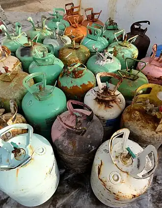 While the production and consumption of CFCs are regulated under the Montreal Protocol, emissions from existing banks of CFCs are not regulated under the agreement. In 2002, there were an estimated 5,791 kilotons of CFCs in existing products such as refrigerators, air conditioners, aerosol cans and others.[39] Approximately one-third of these CFCs are projected to be emitted over the next decade if action is not taken, posing a threat to both the ozone layer and the climate.[40] A proportion of these CFCs can be safely captured and destroyed by means of high temperature, controlled incineration which destroys the CFC molecule.[41]
