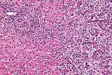 Micrograph of an intrahepatic cholangiocarcinoma (right of image) adjacent to normal liver cells (left of image). H&E stain.