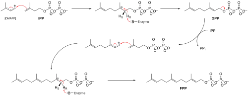 Three molecules of isopentenyl pyrophosphate condense to form farnesyl pyrophosphate through the action of geranyl transferase.