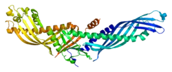 The crystal structure of CETP is that of dimer of two TUbular LIPid (TULIP) binding domains.[3][4] Each domain consists of a core of 6 elements: 4 beta-sheets forming an extended superhelix; 2 flanking elements that tend to include some alpha helix. The sheets wrap around the helices to produce a cylinder 6 x 2.5 x 2.5 nm. CETP contains two of these domains that interact head-to-head via an interface made of 6 beta-sheets, 3 from each protomer. The same fold is shared by Bacterial Permeability Inducing proteins (examples: BPIFP1 BPIFP2 BPIFA3 and BPIFB4), phospholipid transfer protein (PLTP), and long-Palate Lung, and Nasal Epithelium protein (L-PLUNC). The fold is similar to intracellular SMP domains,[5] and originated in bacteria.[6][7][8] The crystal structure of CETP has been obtained with bound CETP inhibitors.[9] However, this has not resolved the doubt over whether CETP function as a lipid tube or shuttle.[10]