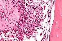Chondroid differentiation is a common feature of chondroblastoma.[10][12][13] A typical histological appearance consists of a combination of oval mononuclear and multi-nucleated osteoclast-type giant cells.[10][7][12] However this is not a prerequisite for diagnosis, as cells with epithelioid characteristics have been observed in lesions of the skull and facial bones.[12] A "chicken-wire" appearance is characteristic of chondroblastoma cells and is the result of dystrophic calcification that may surround individual cells.[10][14] Although, calcification may not be present and is not a prerequisite for diagnosis.[10][7][12] Mitotic figures can be observed in chondroblastoma tissue but are not considered atypical in nature, and therefore, should not be viewed as a sign of a more serious pathology.[10][12] There is no correlation between mitotic activity and location of the lesion.[12] Furthermore, the presence of atypical cells is rare and is not associated with malignant chondroblastoma.[10][13] There are no discernible histological differences observed when comparing the aggressive form of chondroblastoma that can cause recurrence or metastases with its less aggressive, benign, counterpart.