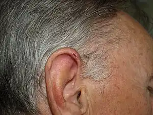 Chondrodermatitis nodularis chronica helicis is a small, nodular, tender, chronic inflammatory lesion occurring on the helix of the ear, most often in men.[2]: 610