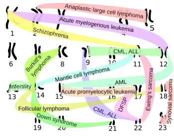 Overview of some chromosomal translocations involved in different cancers, as well as implicated in some other conditions, e.g. schizophrenia,[45] with chromosomes arranged in standard karyogram order. Abbreviations: