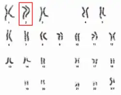 Chromosome 2 is one of the twenty-three pairs of chromosomes in humans. People normally have two copies of this chromosome. Chromosome 2 is the second-largest human chromosome, spanning more than 242 million base pairs[4] and representing almost eight percent of the total DNA in human cells.