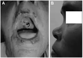 Specific infections, such as syphilis, leprosy and rhinoscleroma, may cause destruction of the nasal structures leading to atrophic changes. Atrophic rhinitis can also result from long-standing purulent sinusitis or radiotherapy of the nose, or as a complication of surgery of the turbinates.[2] The United Kingdom National Health Service has stated that "Most cases of atrophic rhinitis in the UK occur when the turbinates are damaged or removed during surgery".[3] Some authors refer to as Atrophic rhinitis secondary to sinus surgery as the empty nose syndrome.[2]