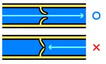B-flow ultrasonograph over a valve of the great saphenous vein, showing a venous reflux (flow toward right in the image).