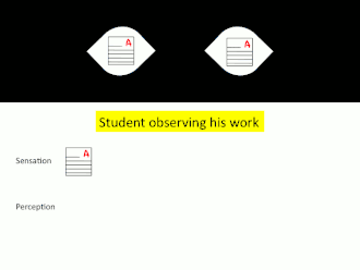 - The eyes receive information from the environment regarding one particular focus. This sensory input is sent directly to the visual cortex to be processed. After visual processing, we consciously perceive this object of focus.[9] In the context of a student in a classroom, the student's eyes focus on a paper on their desk. After their eyes collect light reflected off the paper and this information is processed in their visual cortex, the student consciously perceives the paper in front of them.