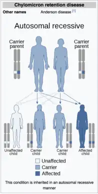 {{cite journal}}: CS1 maint: unflagged free DOI (link) - ↑ Peretti, Noel; Sassolas, Agnès; Roy, Claude C.; Deslandres, Colette; Charcosset, Mathilde; Castagnetti, Justine; Pugnet-Chardon, Laurence; Moulin, Philippe; Labarge, Sylvie; Bouthillier, Lise; Lachaux, Alain (2010-09-29). "Guidelines for the diagnosis and management of chylomicron retention disease based on a review of the literature and the experience of two centers". Orphanet Journal of Rare Diseases. 5 (1): 24. doi:10.1186/1750-1172-5-24. ISSN 1750-1172. PMC 2956717. PMID 20920215.