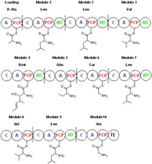 - ↑ Dittmann J, Wenger RM, Kleinkauf H, Lawen A (January 1994). "Mechanism of cyclosporin A biosynthesis. Evidence for synthesis via a single linear undecapeptide precursor". Journal of Biological Chemistry. 269 (4): 2841–6. PMID 8300618.