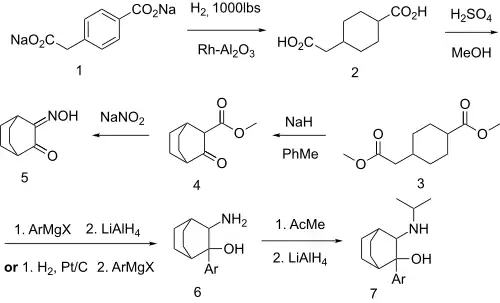 An intramolecular Dieckmann cyclization on methyl 4-(2-methoxy-2-oxoethyl)cyclohexanecarboxylate (3) with sodium hydride base provides methyl 3-oxobicyclo[2.2.2]octane-2-carboxylate (4). Treatment with sodium nitrite introduces an isonitroso group adjacent to the ketone, giving 3-Hydroxyiminobicyclo[2.2.2]octan-2-one (5). Addition of the aryl Grignard reagent, and reduction of the oxime gives (6). A reductive amination of the primary amino group with acetone then completes the synthesis of cilobamine (7).