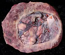 Circumvallate placenta is a rare condition affecting about 1-2% of pregnancies, in which the amnion and chorion fetal membranes essentially "double back" on the fetal side around the edges of the placenta.[1] After delivery, a circumvallate placenta has a thick ring of membranes on its fetal surface.[2] Circumvallate placenta is a placental morphological abnormality associated with increased fetal morbidity and mortality due to the restricted availability of nutrients and oxygen to the developing fetus.