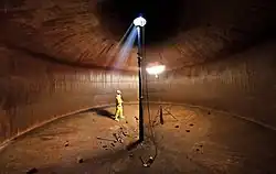 One particularly unique modern utilization of cisterns is found in San Francisco, which has historically been subject to devastating fires. As a precautionary measure, in 1850, funds were allocated to construct over 100 cisterns across the city to be utilized in case of fire.[10] The city's firefighting network, the Auxiliary Water Supply System (AWSS) maintains a network of 177 independent underground water cisterns, with sizes varying from 75,000 US gallons (280,000 L) to over 200,000 US gallons (760,000 L) depending on location with a total storage capacity of over 11 million U.S. gallons (42 million liters) of water.[11] These cisterns are easily spotted at street level with manholes labeled CISTERN S.F.F.D surrounded by red brick circles or rectangles. The cisterns are completely separate from the rest of the city's water supply, ensuring that in the event of an earthquake, additional backup is available regardless of the condition of the city's mainline water system.[12]
