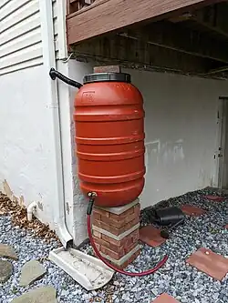 Many greenhouses rely on a cistern to help meet their water needs, particularly in the United States. Some countries or regions, such as Flanders, Bermuda and the U.S. Virgin Islands, have strict laws requiring that rainwater harvesting systems be built alongside any new construction, and cisterns can be used in these cases. In Bermuda, for example, its familiar white-stepped roofs seen on houses are part of the rainwater collection system, where water is channeled by roof gutters to below-ground cisterns.[14] Other countries, such as Japan, Germany, and Spain, also offer financial incentives or tax credit for installing cisterns.[15] Cisterns may also be used to store water for firefighting in areas where there is an inadequate water supply. The city of San Francisco, notably, maintains fire cisterns under its streets in case the primary water supply is disrupted. In many flat areas, the use of cisterns is encouraged to absorb excess rainwater which otherwise can overload sewage or drainage systems by heavy rains (certainly in urban areas where a lot of ground is surfaced and doesn't let the ground absorb water).