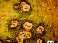 The infection in leaves usually remains latent until the leaves drop, but leaf spots may be found on older leaves.[22][30] The leaf lesions usually produce ascospores, but sometimes produce pycnidia.[13][26][31] These pycnidia release pycnidiospores (conidia) in a gelatinous mass.[32] Under wet conditions, the gelatinous mass dissolves and the spores are dispersed by splashes of water.[33] This splash-dispersal method limits reinfection to nearby fruit or leaves of the same tree.[13][23] Fruit infections remain latent until fruit maturity. Upon maturing, the mycelium grows into the outer rind, also known as a flavedo. Here in the flavedo, circular lesions form, which are sometimes accompanied by pycnidia. It is important to note that while ascospores can infect fruit, they have not yet been observed developing on fruit.[22][23][26]