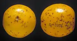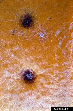 False melanose symptoms can appear on unripe fruit early in the season. They are characterized by many small, tan to chocolate brown, slightly raised lesions.[12] The lesions are much smaller than the hard spot variety with an average diameter of less than 1 mm (.04 in).[13][14] They are difficult to observe later in the season. Unlike hard spot lesions, no pycnidia (asexual fruiting bodies) are present.[15]