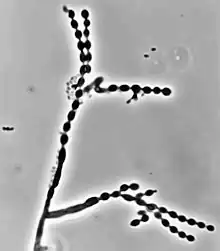 Like many other black yeasts, C. carrionii is sensitive to temperatures above 37 °C.[5] It can be distinguished in culture by the presence of its urease enzyme hydrolyzing urea[8] and its inability to liquefy gelatin.[6][9] Altering temperatures or micronutrient levels such as calcium and phosphate affects whether C. carrionii is in the mycelial or muriform state.[2] The fungus transforms to muriform cells under conditions of temperature between 25 °C to 37 °C, 0.1 mM Ca2+, and a pH of 2.5.[7] It produces multiple conidia in long, straight chains that bud off the hyphae, with the youngest conidia farthest from the hyphae.[2] There is no sexual state known for C. carrionii.[5]