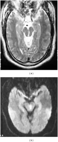 | a,b) Severely motion degraded axial T2-weighted and DWI images of midbrain demonstrate a subacute infarct within the left midbrain tegmentum | |