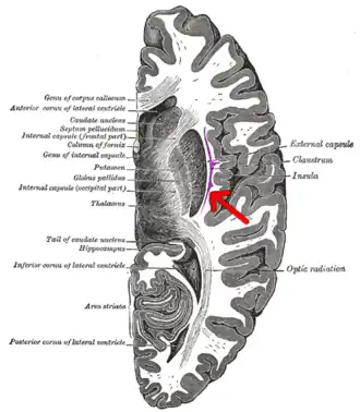 ![]() Transverse section of human cerebrum. (Anterior is at the top.) The claustrum is indicated by the arrow. | |