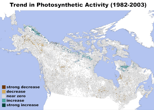 It has been hypothesized that the boreal environments have only a few states which are stable in the long term - a treeless tundra/steppe, a forest with >75% tree cover and an open woodland with ~20% and ~45% tree cover. Thus, continued climate change would be able to force at least some of the presently existing taiga forests into one of the two woodland states or even into a treeless steppe - but it could also shift tundra areas into woodland or forest states as they warm and become more suitable for tree growth.[73] Consistent with that, a Landsat analysis of 100,000 undisturbed sites found that the areas with low tree cover became greener in response to warming, but areas with a lot of trees got more "brown" as some of them died due to the same.[74]
