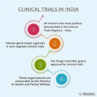 - 1 2 3 Imran, M; Najmi, AK; Rashid, MF; Tabrez, S; Shah, MA (January 2013). "Clinical research regulation in India-history, development, initiatives, challenges and controversies: Still long way to go". Journal of Pharmacy & Bioallied Sciences. 5 (1): 2–9. doi:10.4103/0975-7406.106553. PMC 3612334. PMID 23559817.