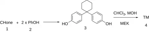 The condensation between cyclohexanone (1) and phenol (2) gives bisphenol Z (3).[4] This is treated with chloroform and methyl ethyl ketone (MEK) in the presence of base. The resulting Bargellini reaction gives clinofibrate (4).[5]