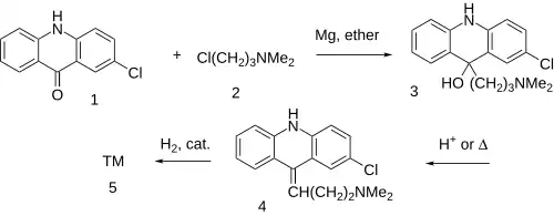 Clomacran can be synthesized beginning with 2-chloroacridone (1) which is reacted with a Grignard reagent derived from 3-chloro-N,N-dimethylpropylamine (2) to afford the tertiary carbinol (3).[9][10][11][12] Dehydration by means of acid or simply heat gives the corresponding olefin (4). Catalytic reduction completes the synthesis of clomacran (5).