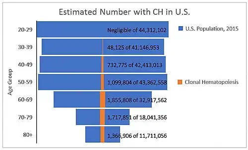 The advent of next-generation DNA sequencing has allowed for the targeted identification of somatic mutations involved in clonal hematopoiesis at the population level. The studies undertaken as of 2017 are largely consistent in their main findings. One common finding has been that observable clonal hematopoiesis is virtually absent from the under-40 population, with a sharp uptick in frequency past 60 years of age.[4][5][6] Indeed, the evidence from these studies suggests that between 10% and 20% of the population over age 70 have clonal hematopoiesis. In the U.S. alone, this means that, at the low end, some 2,975,000 seniors over 70 years of age are living with this condition.[26]