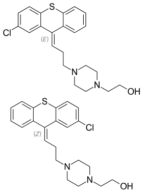 Clopenthixol is a mixture of cis and trans isomers. Zuclopenthixol, the pure cis isomer, was later introduced by Lundbeck in 1962,[2] and has been much more widely used. Both drugs are equally effective as antipsychotics and have similar adverse effect profiles, but clopenthixol is half as active on a milligram-to-milligram basis and appears to produce more sedation in comparison.[3]