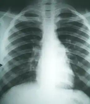 Chest X-rays rarely demonstrate nodules or cavities in the lungs, but these images commonly demonstrate lung opacification, pleural effusions, or enlargement of lymph nodes associated with the lungs.[1] Computed tomography scans of the chest are more sensitive than chest X-rays to detect these changes.[1]