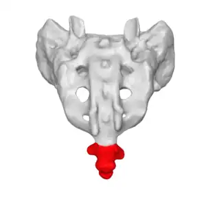 | The location of the coccyx (in red) at the lower aspect of the sacrum of the pelvis | |