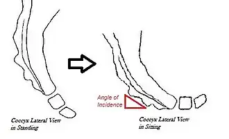 Sagittal coccygeal movement is measured using the angle of incidence—or the angle at which the coccyx strikes the seat when an individual sits down.[10] A smaller angle indicates the coccyx being more parallel to the seat, resulting in flexion (or “normal” movement) of the coccyx.[10] A larger angle indicates the coccyx being more perpendicular to the seat, causing posterior subluxation (or “backward” movement) of the coccyx.[10]