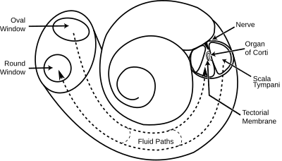 - ↑ Manoussaki D, Chadwick RS, Ketten DR, Arruda J, Dimitriadis EK, O'Malley JT (2008). "The influence of cochlear shape on low-frequency hearing". Proc Natl Acad Sci U S A. 105 (16): 6162–6166. Bibcode:2008PNAS..105.6162M. doi:10.1073/pnas.0710037105. PMC 2299218. PMID 18413615.