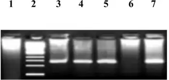 | Coinfection Hepatitis B virus and Hepatitis D virus -Gel photograph of different HDV product, Lane 1: HDV negative; Lane 2: Ladder marker; Lanes 3-5: showing HDV positive samples (137-base pairs); Lane 6 showing negative control; Lane 7 is positive control | |