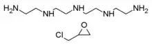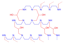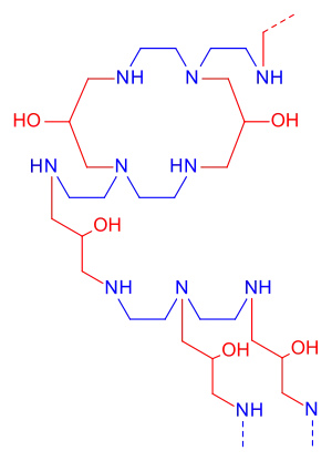 Colestipol is a copolymer of diethylenetriamine (DETA) —or tetraethylenepentamine according to some sources[8][9]— and epichlorohydrin.[10][11] The structure drawing (top right) shows the DETA moieties in blue and the epichlorohydrin moieties in red.