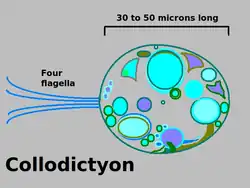 Collodictyon is a genus of single-celled, omnivorous eukaryotes belonging to the collodictyonids, also known as diphylleids.[1][2] Due to their mix of cellular components, collodictyonids do not belong to any well-known kingdom-level grouping of that domain and this makes them distinctive from other families.[3][4] Recent research places them in a new "super-group" called CRuMs together with rigifilids and Mantamonas.[5]