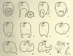 Diagram of Collodictyon failed ingestion of a Pandorina. The Pandorina escapes and the Collodictyon dies from water loss. Sketched by researcher Robert Clinton Rhodes; sketch appeared in print in 1917.