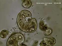 - Large Colpoda amongst many smaller ones with other ciliates 100X