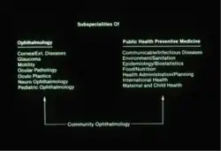 Community ophthalmology was described as a new discipline in medicine promoting eye health and blindness prevention through programs utilizing methodologies of public health, community medicine, and ophthalmology in 1978. This new discipline was first proposed[1] by Dr. Patricia E. Bath in 1978 after observations of epidemics rates of preventable blindness among under-served populations in urban areas in the US as well as under-served populations in so called third-world countries .[2][3]