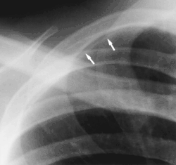 - Clavicular companion shadow is a thin soft-tissue stripe along the upper edge of the clavicle.[1]