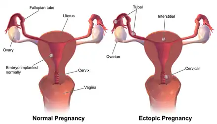 • Miscarriage. The loss of the developing fetus prior to 20 weeks of pregnancy.[37] Common causes may be related to chromosomal abnormalities (abnormal genetic makeup) of the fetus but can also include ectopic pregnancy, maternal age, and other factors.[39]