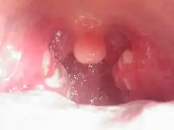 Streptococcal pharyngitis, also known as strep throat, is an infection of the respiratory tract caused by group A Strep, Streptococcus pyogenes, a gram-positive, cocci, beta-hemolytic (lyses blood cells) bacteria.[42] It is primarily spread by direct contact and the transfer of fluids via oral or other secretions and manifests largely in children.[42] Common symptoms associated with streptococcal pharyngitis include sore throat, fever, white excretions at the back of the mouth, and cervical adenopathy (swollen lymph nodes underneath the chin and around the neck area).[43] Streptococcal pharyngitis can lead to various complications[44] and recurrent infection can increase the likelihood. In many of these, lack of treatment[45] and the body's immune response is responsible for the additional adverse reactions.[46] These include:[44]